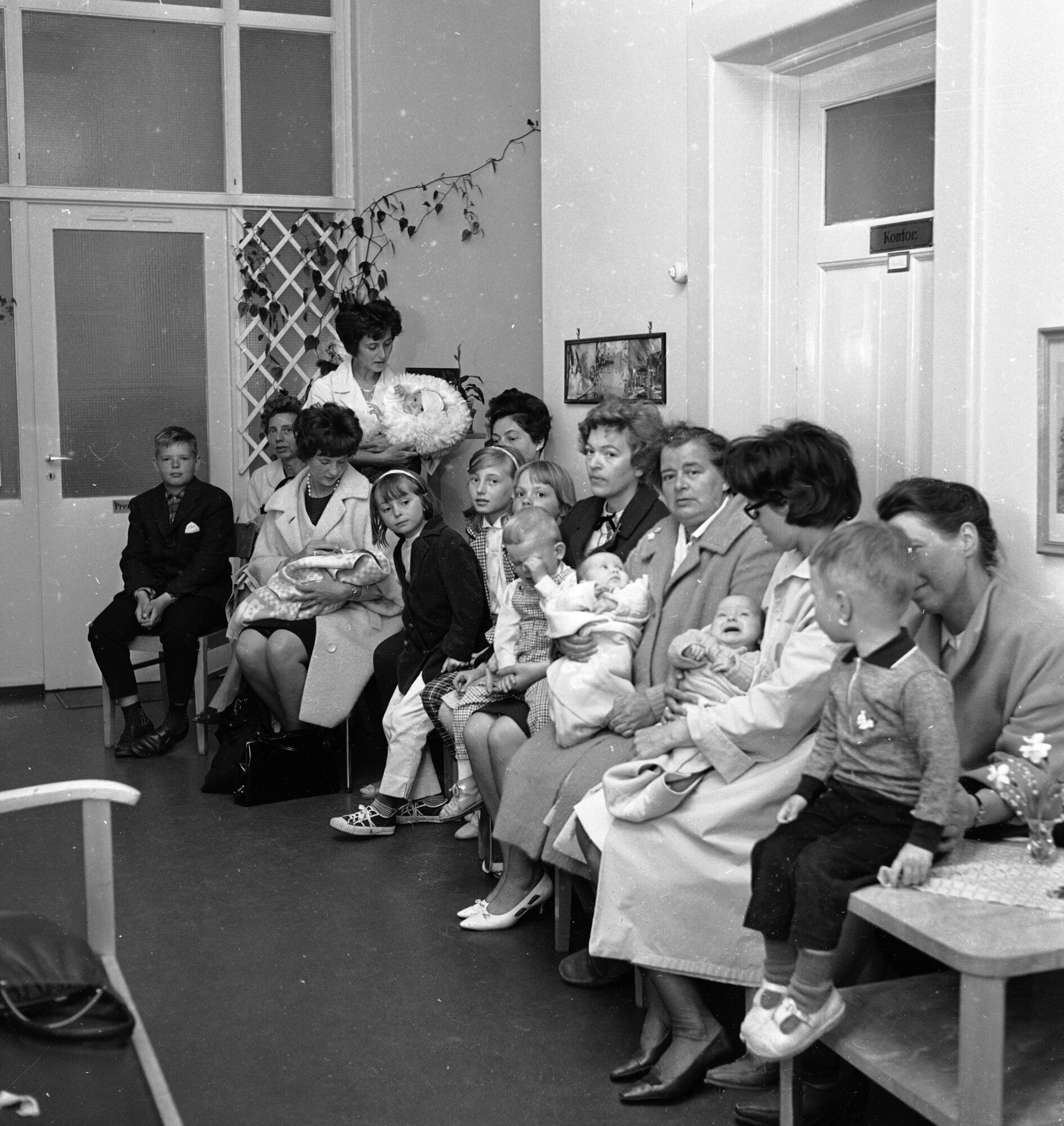 Aftenpostens journalist omtaler dette som «ventegangen» på barne- og kvinneklinikken på Ullevål sykehus. «Den tjener som et felles venteværelse for overlegen og samtlige leger ved avdelingen», heter det av billedteksten. Fotografiet ble tatt 6. mai 1964. Bildet står på trykk i siste utgave av Helsesøstre (2-2016) som utkom med Sykepleien 19. mai.