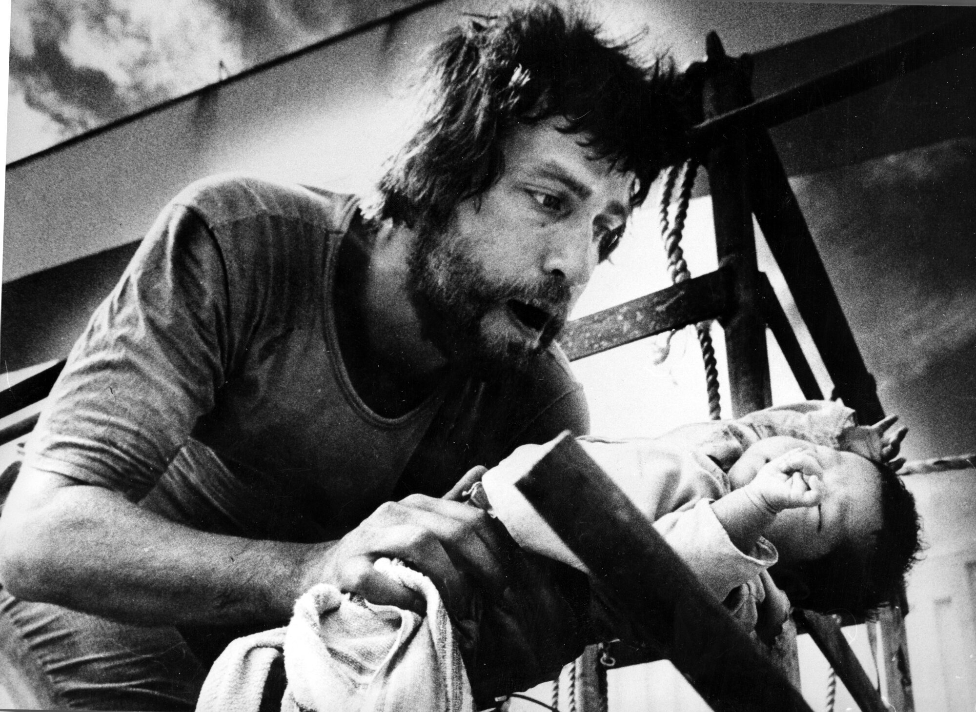 I kjølvannet av Vietnamkrigen flyktet hundretusener av vietnamesere over havet i utrygge og gamle båter. Flyktningstrømmen varte fra slutten av 1970-årene og inn i 1980-årene. På bildet ser vi journalist Erling Borgen med et barn som ble plukket opp fra Sør-Kinahavet i 1979. Han befant seg på det norske lasteskipet «Lysekil» sammen med Aftenpostens fotograf Erik Berglund. De var utsendte reportere, men deltok også i selve redningsaksjonen. Her løfter Borgen et spedbarn opp i skipet. Bildet ble senere kåret til årets bilde.