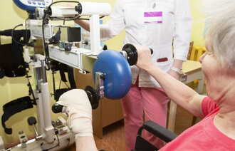 I treningsrommet på Bakke løfter Kari Wetlesen venstre fot opp på et trinn. Så følger protesebeinet etter. Hun jobber langsomt og konsentrert.