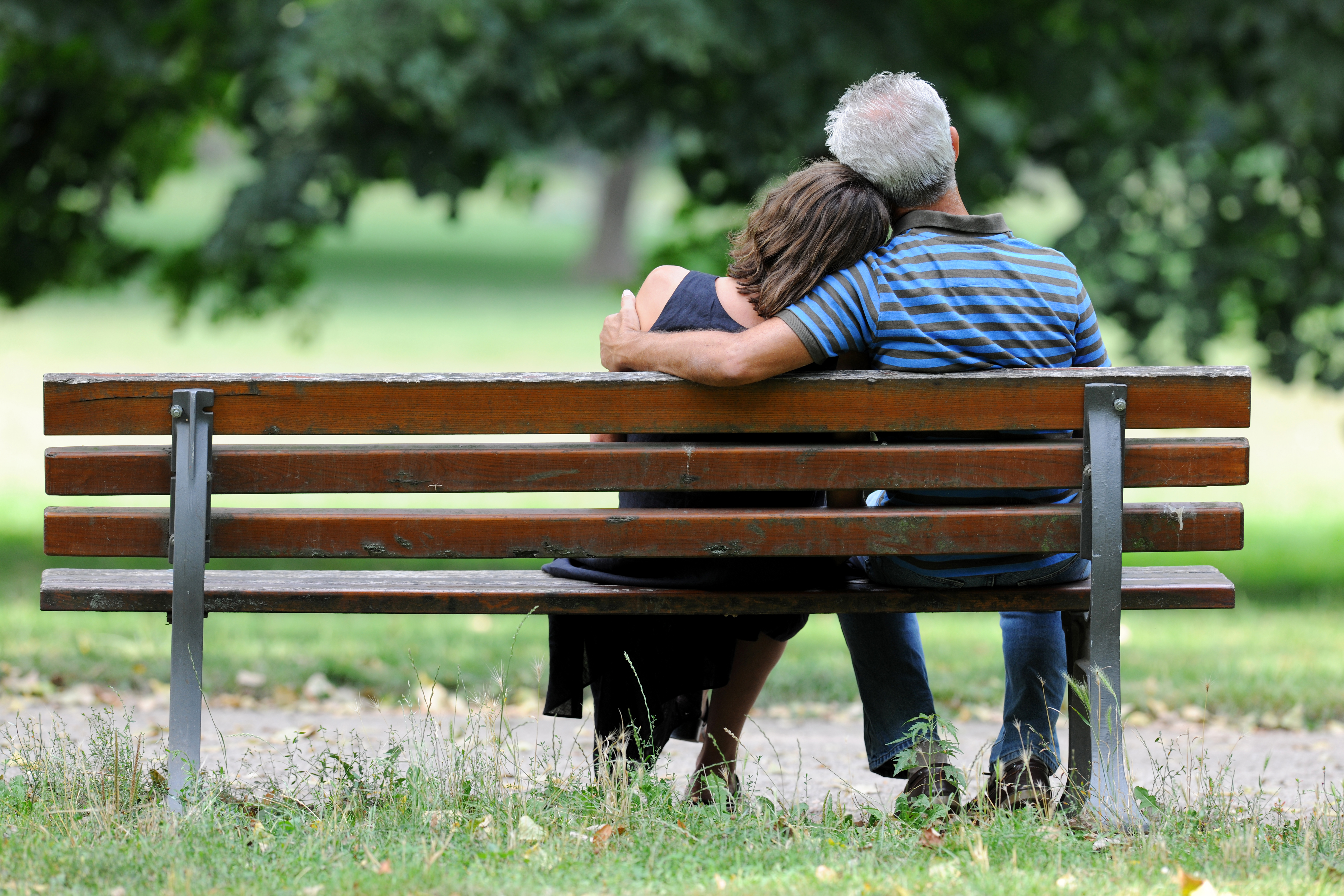 Bildet viser to mennesker som sitter på en benk sett bakfra.