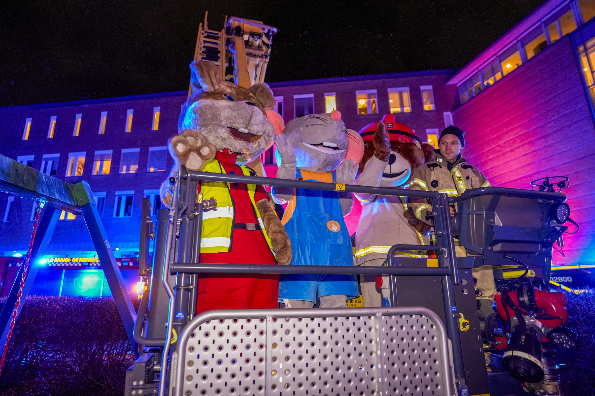 Brannbamsen Bjørnis, som brukes av brannvesenet for å gi barn informasjon om brannvern, deltok også på besøkene.