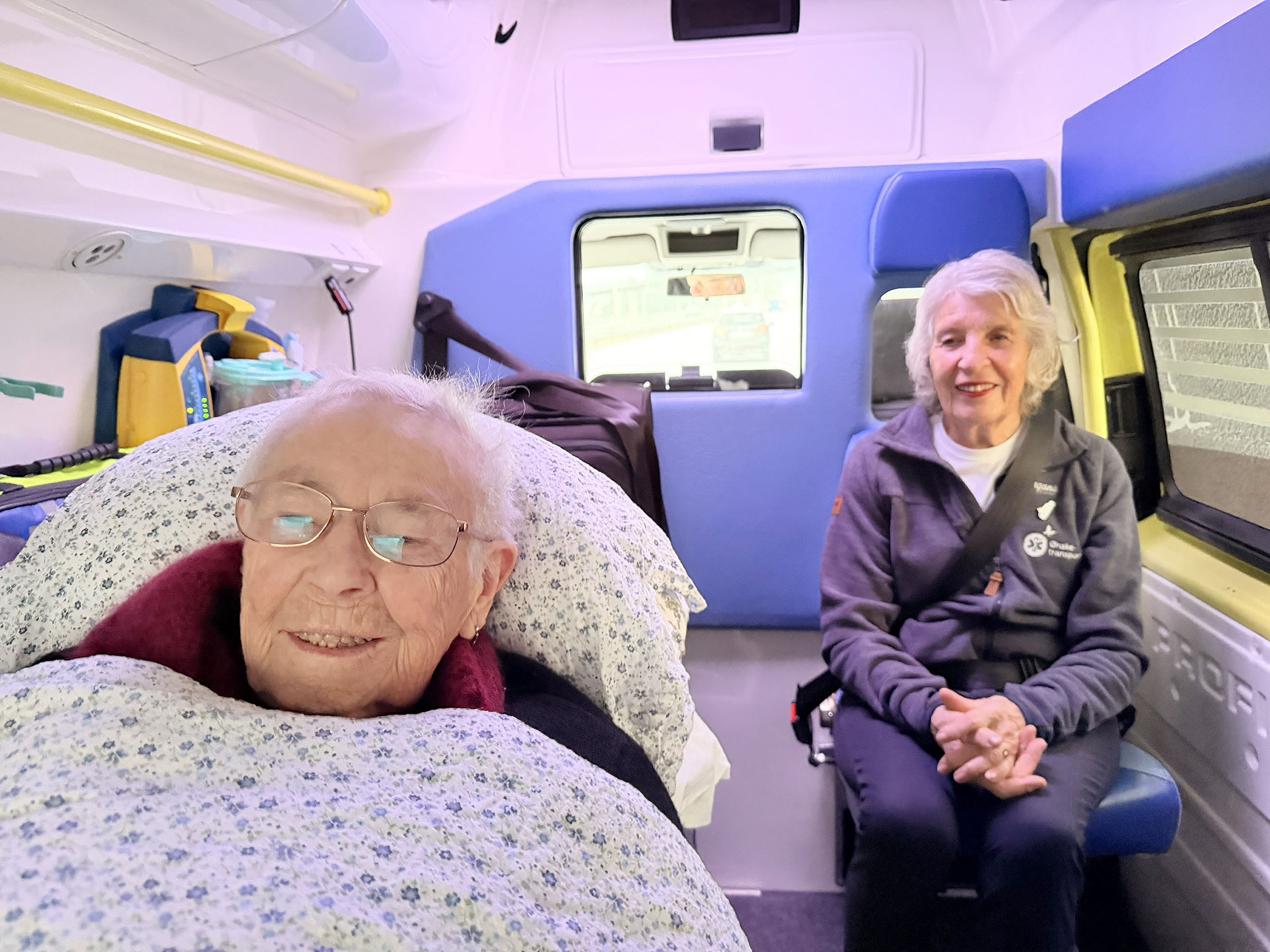 Når hun ikke sover følger 91-åringen nøye med ut av vinduet bak i ambulansen og ut av sidevinduet.