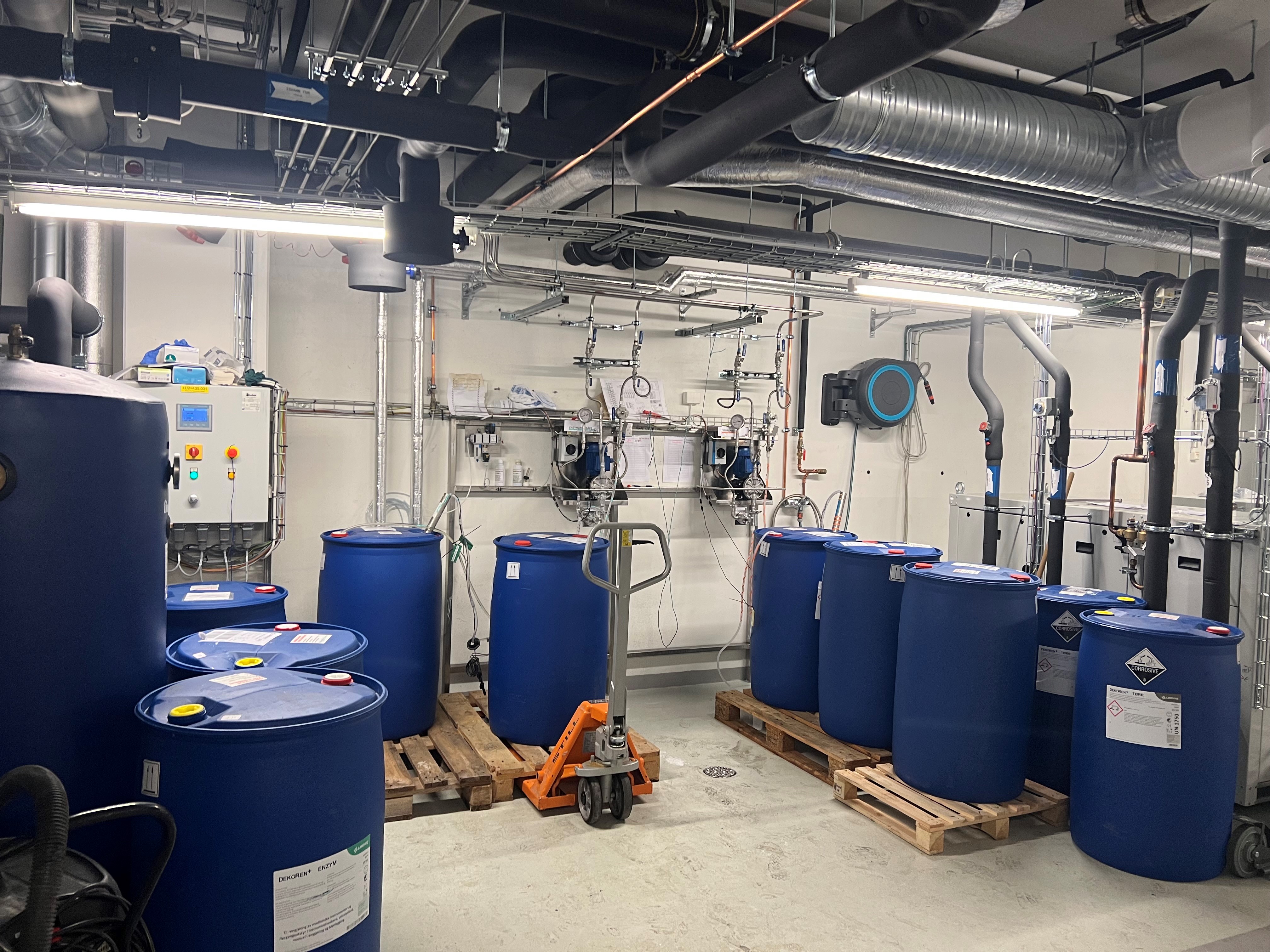 Feilen skjedde i det sentrale såpeanlegget på steril forsyning. Der tilføres vaskemaskinene såpe og tørkemiddel automatisk, fra hver sin 200-liters beholder som står side om side. Beholderne er fysisk like og er koblet til hvert sitt utløp.