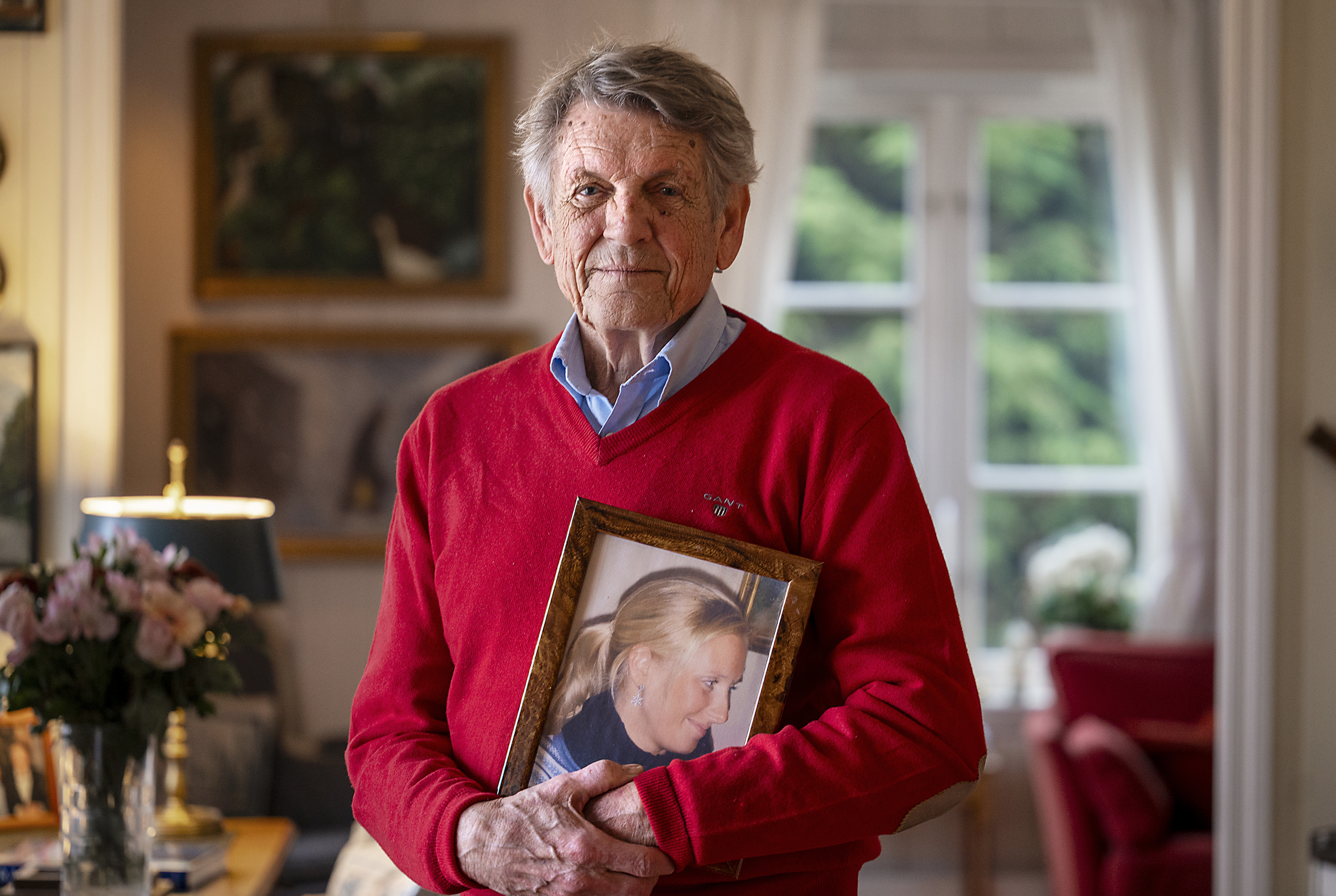 Bildet viser Jan-Erik Sverre som holder et bilde av datteren.