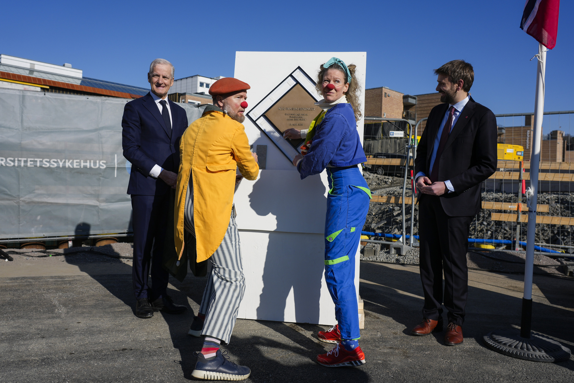 Statsminister Jonas Gahr Støre og helseminister Jan Christian Vestre sammen med sykehusklovnene ved grunnsteinen for det nye Rikshospitalet torsdag.