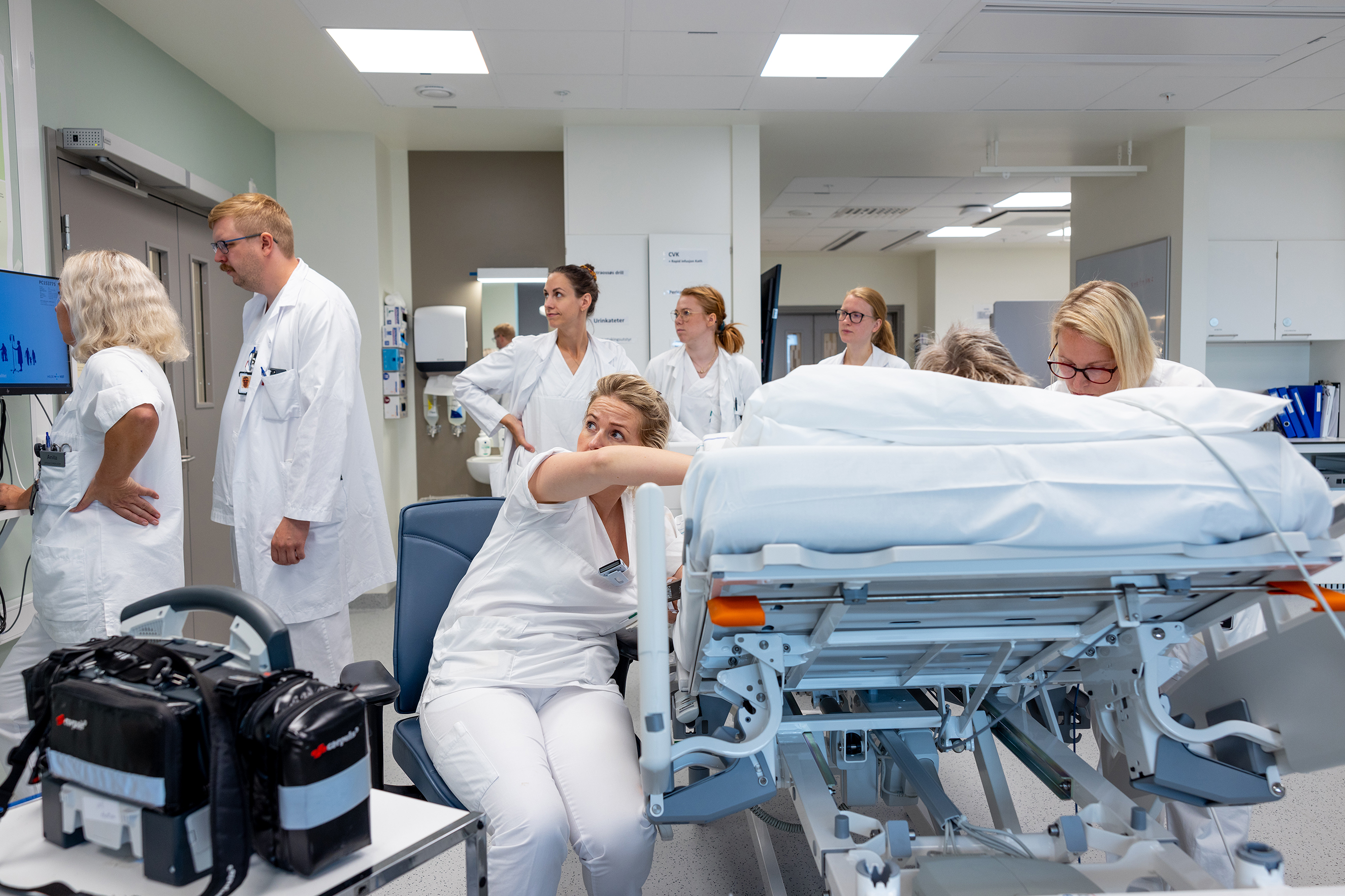 Det er mye helsepersonell til stede når en rød pasient kommer til akuttmottaket på sykehuset i Haugesund.