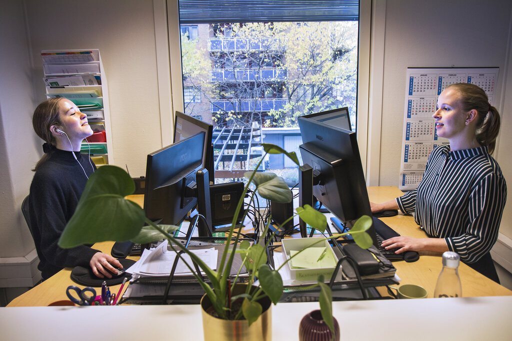 Pasientene har kroniske sykdommer. Sykepleierne følger dem opp. Her driver sykepleierne Ane H. Walle og Kaja Bast Sørsdal med medisinsk avstandsoppfølging.