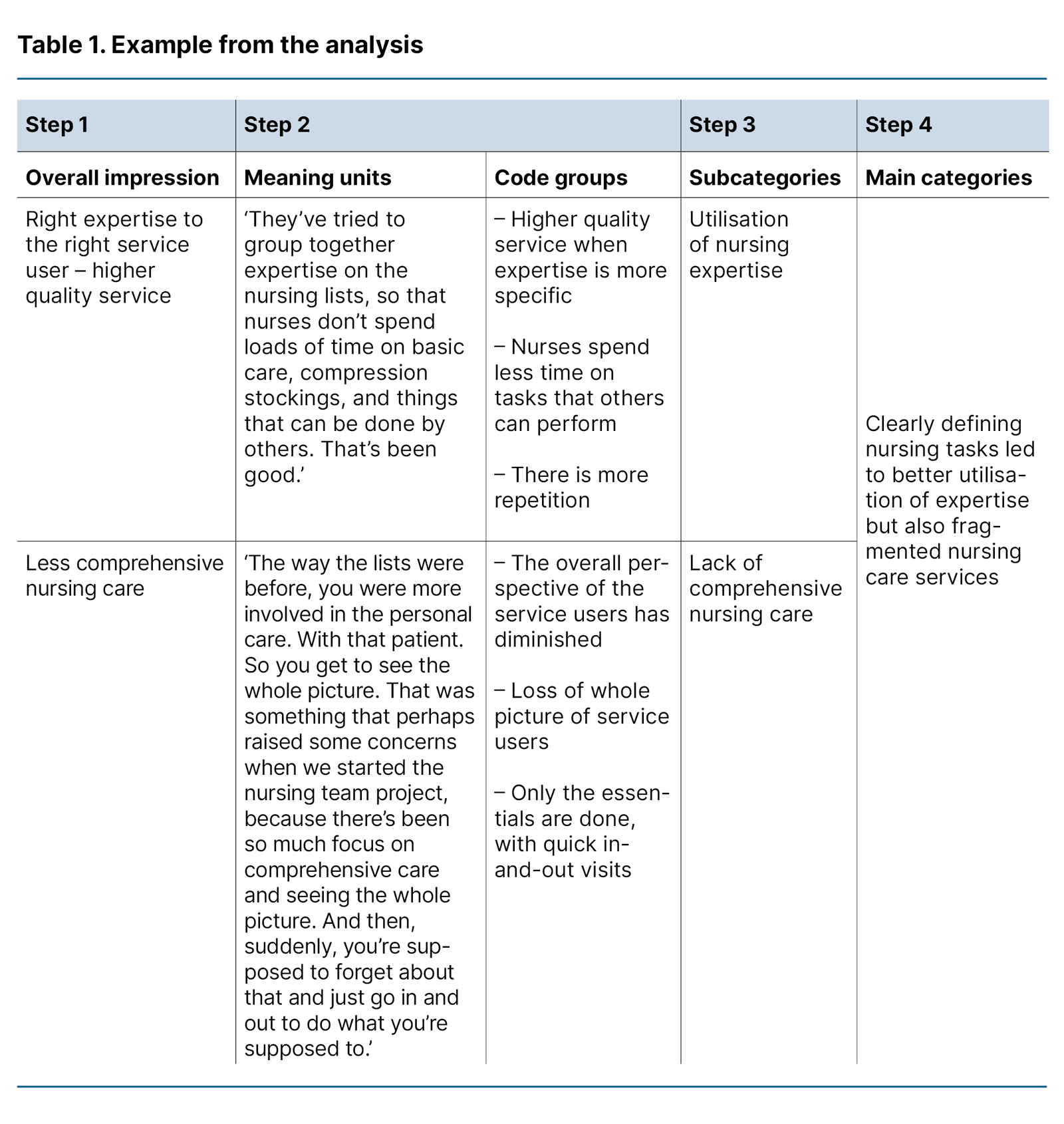 ‘The way the lists were before, you were more involved in the personal care. With that patient. So you get to see the whole picture. That was something that perhaps raised some concerns when we started the nursing team project, because there’s been so much focus on comprehensive care and seeing the whole picture. And then, suddenly, you’re supposed to forget about that and just go in and out to do what you’re supposed to.’ (Participant 5)