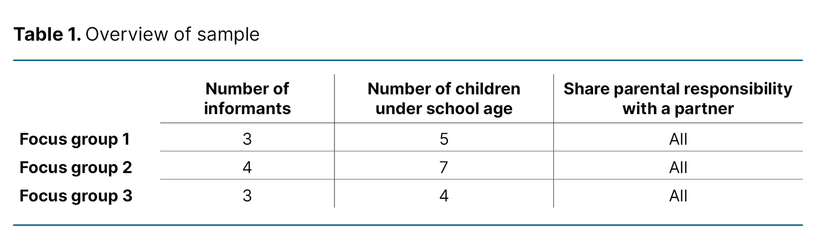 The inclusion criteria were having at least one child under school age and the ability to participate in a group discussion in Norwegian. A total of ten informants were recruited, distributed across three focus groups. Seven women and three men participated in the study. They all had a partner with whom they shared parental responsibility, and the majority had two children under school age in the family (Table 1). The sample was homogenous in terms of socioeconomic background and ethnicity.