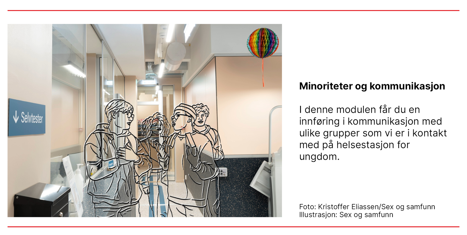 Minoriteter og kommunikasjon: Modulen gir en innføring i hvordan HFU kan være inkluderende og møte ulike brukergrupper på en trygg måte. Temaer som tas opp, inkluderer blant annet gutter og seksualitet, porno og nakenbilder, erfaringer med bytte, kjøp eller salg av seksuelle tjenester, seksualisert rusbruk, funksjonsvariasjon, omskjæring og minoritetsstress.