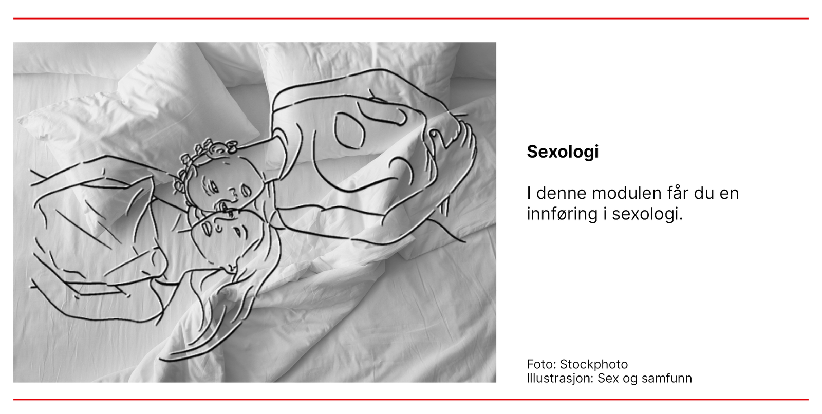 Sexologi: Modulen gir en grunnleggende innføring i sexologi og tar utgangspunkt i Sex og samfunns prosedyrer og retningslinjer i Metodebok for seksuell helse (6). De digitale foredragene tar for seg seksuelle rettigheter, normer, identitet, overgrep og vanlige seksuelle utfordringer. Det legges vekt på hvordan helsepersonell kan snakke med ungdom om seksualitet, både i individuelle samtaler og i grupper.