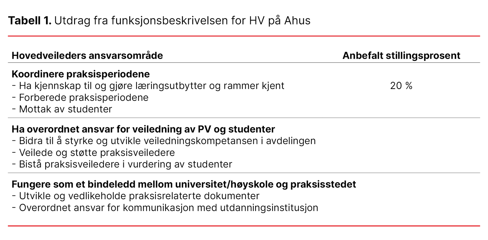 Det ble utarbeidet en funksjonsbeskrivelse for HV med krav om formell veiledningskompetanse og beskrivelse av ansvarsområder (tabell 1). Prosjektet la samtidig økt vekt på tiltak for å styrke PVs veiledningskompetanse.