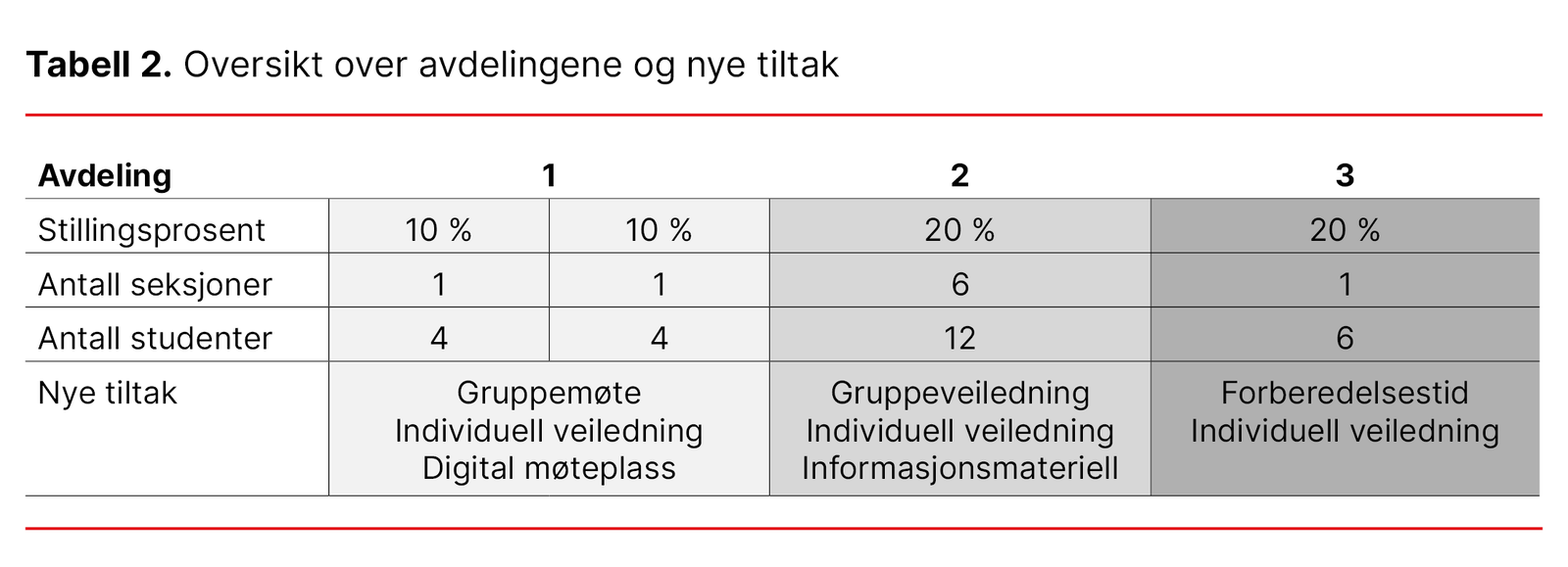 Organiseringen av studentoppfølgingen ved avdelingene varierte ved oppstart. Alle HV hadde formell veiledningskompetanse og erfaring som PV. Basert på egne erfaringer, møter og kartlegging på avdelingene ble det tilpasset nye tiltak for å støtte og styrke PV (tabell 2).