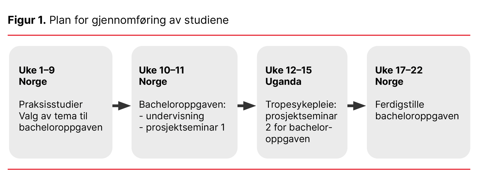 Studentene skulle følge undervisning og praksisstudier ved MUK, men kunne selv velge om de ville ta eksamen i tropesykepleie. Initiativet ble støttet av ledelsen og fagmiljøene ved både MUK og UiA, forutsatt at studentene fulgte planen for gjennomføring som skissert i figur 1.
