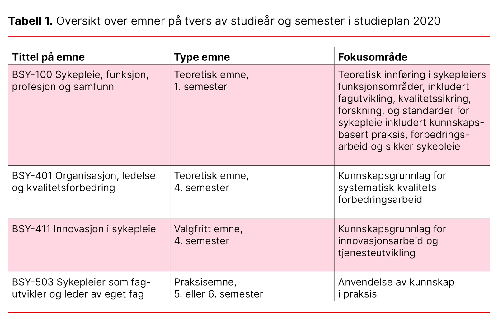 Ved Lovisenberg diakonale høgskole (LDH) ble innovasjon, forbedringsarbeid og fagutvikling innarbeidet som fagområder i Studieplan 2020, både i teoretiske emner og i praksisemner (se tabell 1).