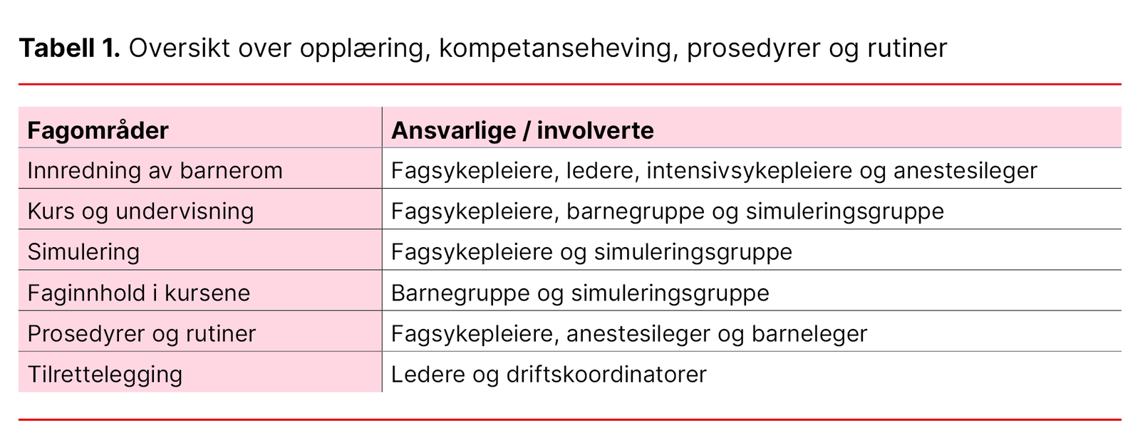 Tabell 1. Oversikt over opplæring, kompetanseheving, prosedyrer og rutiner