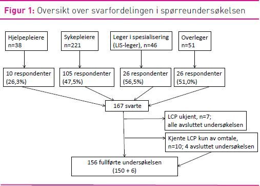 Seks sengeposter på HDS og to på HUS inngikk i undersøkelsen: En palliativ sengeenhet, en overvåkningsavdeling, fem ulike medisinske sengeposter og en døgnpost på kreftavdeling. Avdelingene hadde brukt LCP fra seks måneder til 3,5 år, halvparten i mer enn to år. Hele pleiepersonalet og legegruppen på disse postene (356 personer) fikk i desember 2010 tilsendt en personlig link til spørreundersøkelsen via e-post, med to automatiske påminnelser. Svarene ble analysert med deskriptiv statistikk i programmet SurveyMonkey.