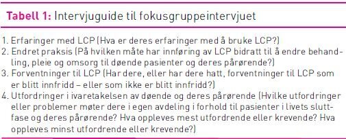 For å se om målet om bedre kvalitet i omsorgen for døende ble nådd, er det gjort en gjennomgang av journaldokumentasjonen ved dødsfall før og etter innføring av LCP på flere av postene. Gjennomgangen har vist forbedring av både rutiner og dokumentasjon etter innføring av tiltaksplanen (upubliserte data). I forlengelsen av dette ønsket vi å evaluere personalets erfaringer, med tanke på videre bruk av planen og innføring i nye avdelinger og institusjoner. Disse erfaringene har blitt ytterligere aktualisert etter at medieoppslag knyttet til bruken av LCP i engelske akuttsykehus førte til en granskingsrapport med påfølgende utfasing av LCP i England i løpet av 2014 (7).