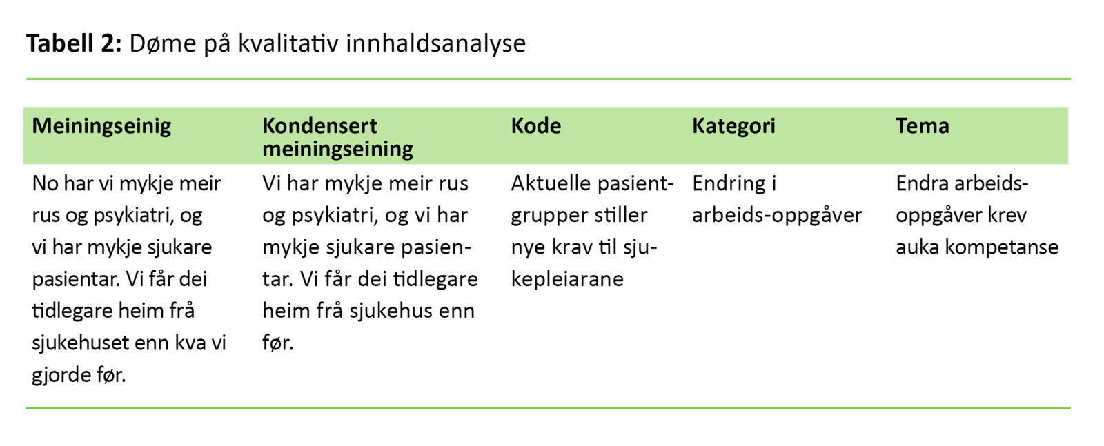 Deretter sorterte vi materialet i kategoriar, og til sist vart det latente innhaldet i materialet formulert som tre ulike tema. Tabell 2 viser døme på korleis vi gjennomførte den kvalitative innhaldsanalysen.
