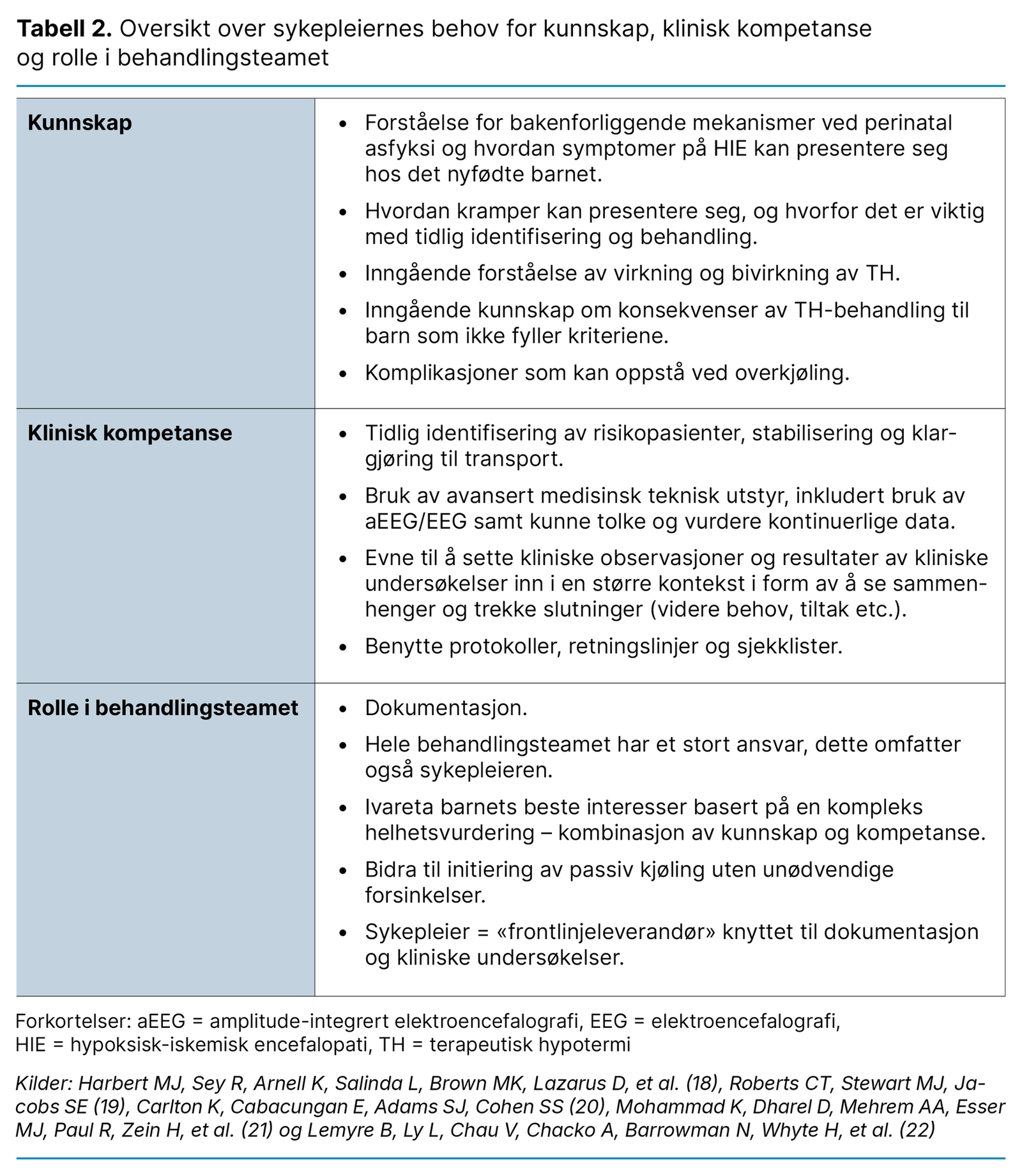 Sykepleiere har behov for kunnskap og klinisk kompetanse som er knyttet til tidlig identifisering av risikopasienter, stabilisering og klargjøring til transport. Videre har sykepleierne behov for kunnskap om komplikasjoner som kan inntreffe ved overkjøling, samt inngående forståelse av virkning og bivirkning av TH. Klinisk kompetanse innebærer at de kan bruke avansert medisinskteknisk utstyr, inkludert bruk og tolkning av aEEG eller EEG.