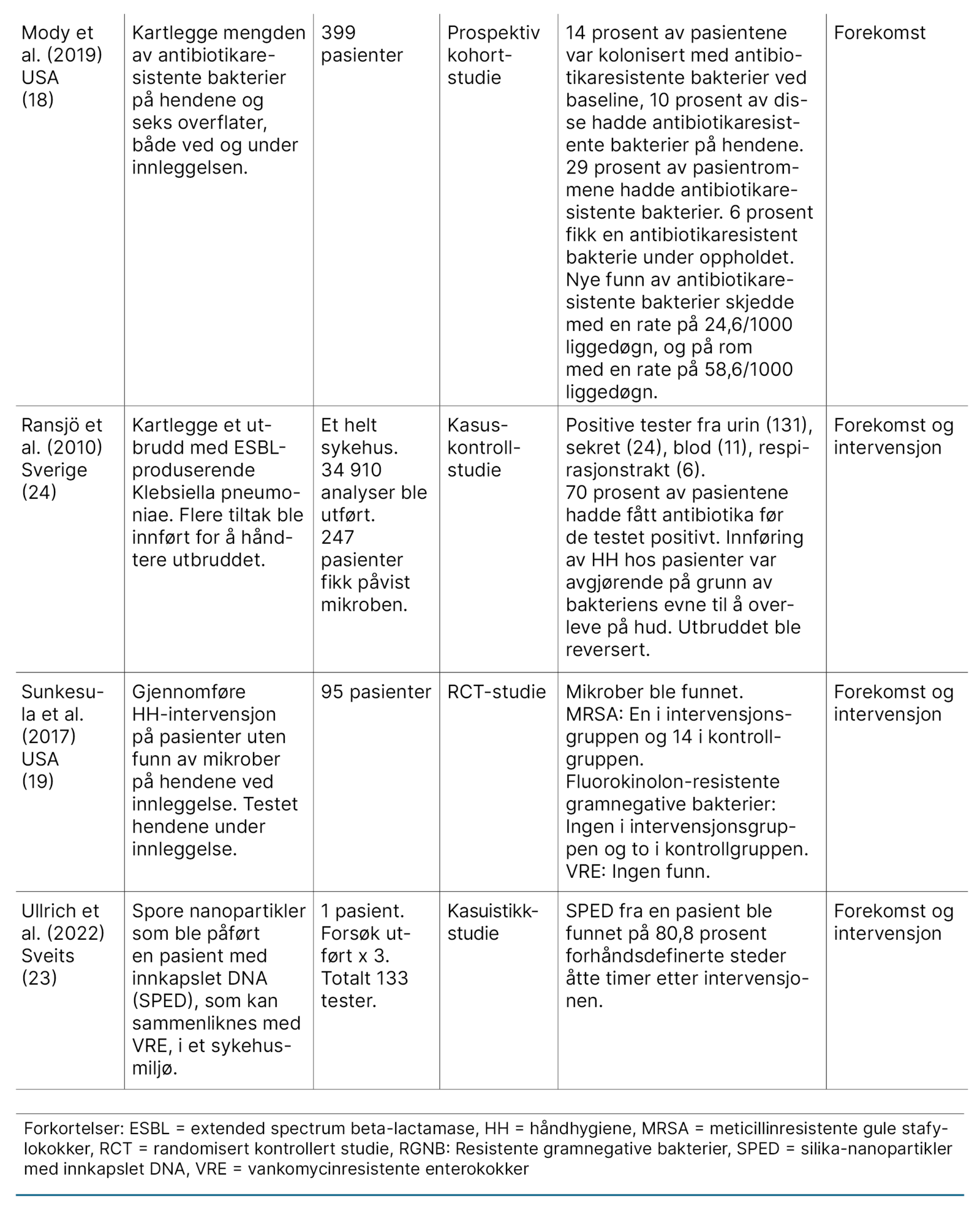 Fire studier undersøkte forekomsten av antibiotikaresistente tarmbakterier på sykehuspasientenes hender (18, 19, 21, 23). Alle fire fant tilstedeværelse av antibiotikaresistente tarmbakterier i tillegg til andre bakterier. To av studiene undersøkte hendene 48 timer etter innleggelse på sykehus (21, 25).