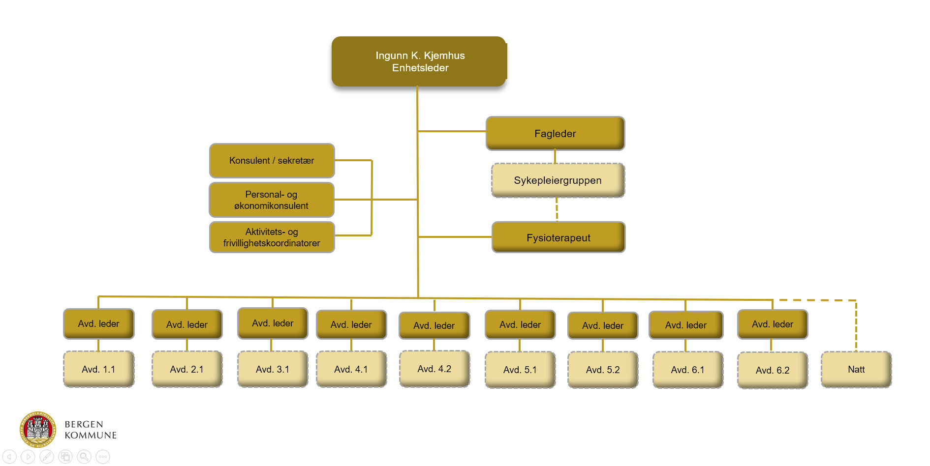 Sykehjemmet har siden oppstart i 2004 vært organisert med sykepleiere i stab. Både beboerne og de ansatte er fornøyde med organiseringen.